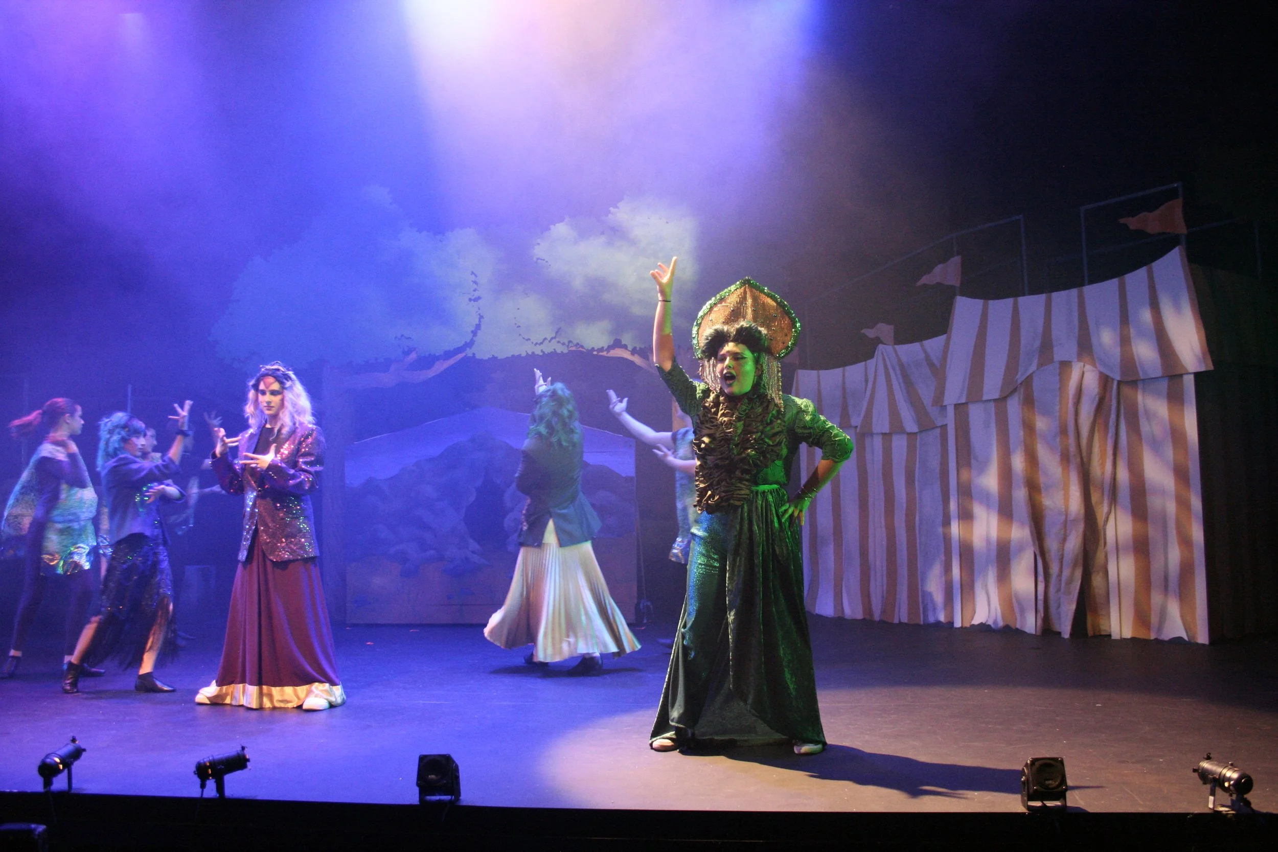 Pythio stands in a snake-themed costume under purple and yellow stage lighting, with a backdrop of a painted outdoor scene. Head Over Heels - Berkeley Playhouse