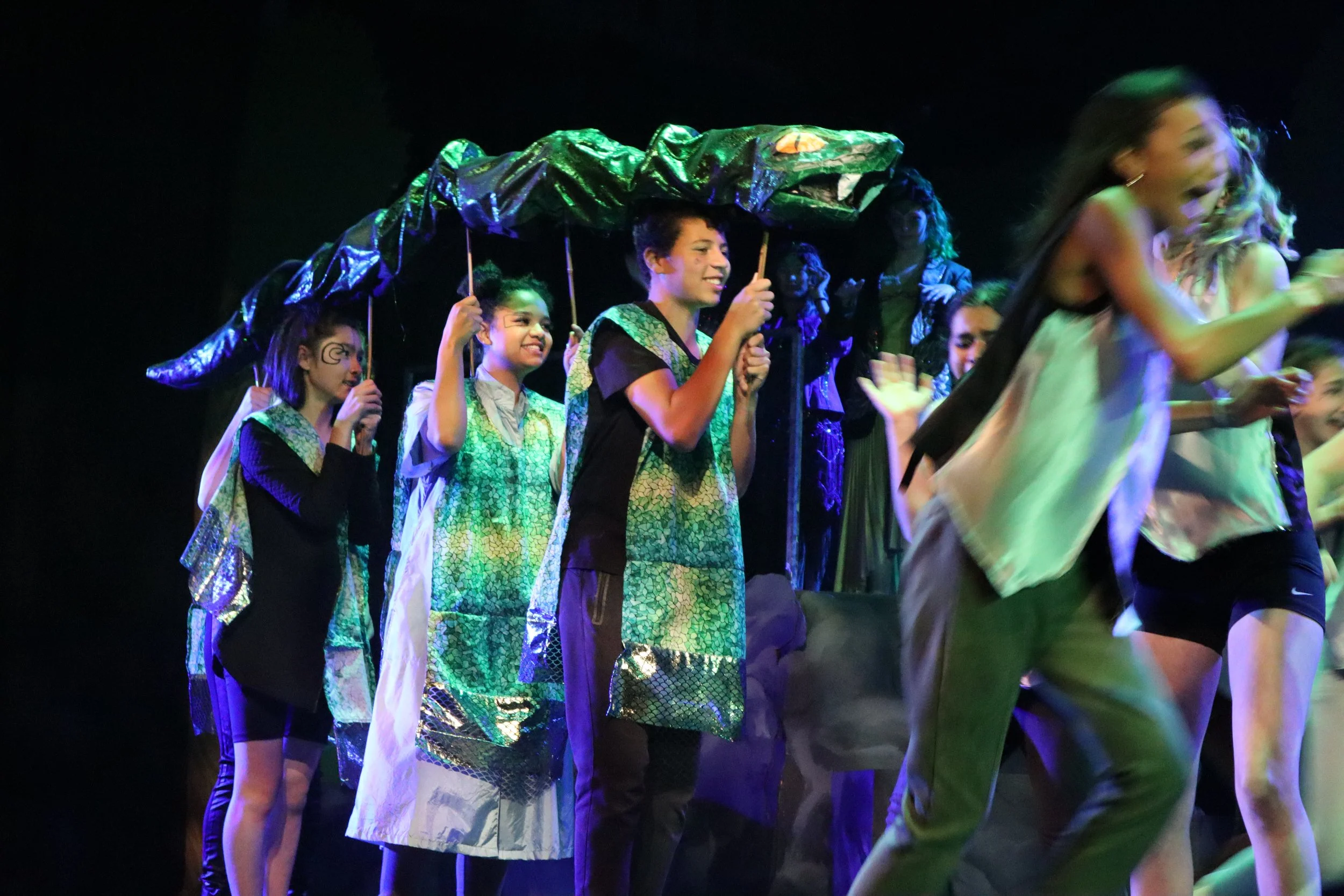 Group of actors with a snake puppet. Head Over Heels - Berkeley Playhouse