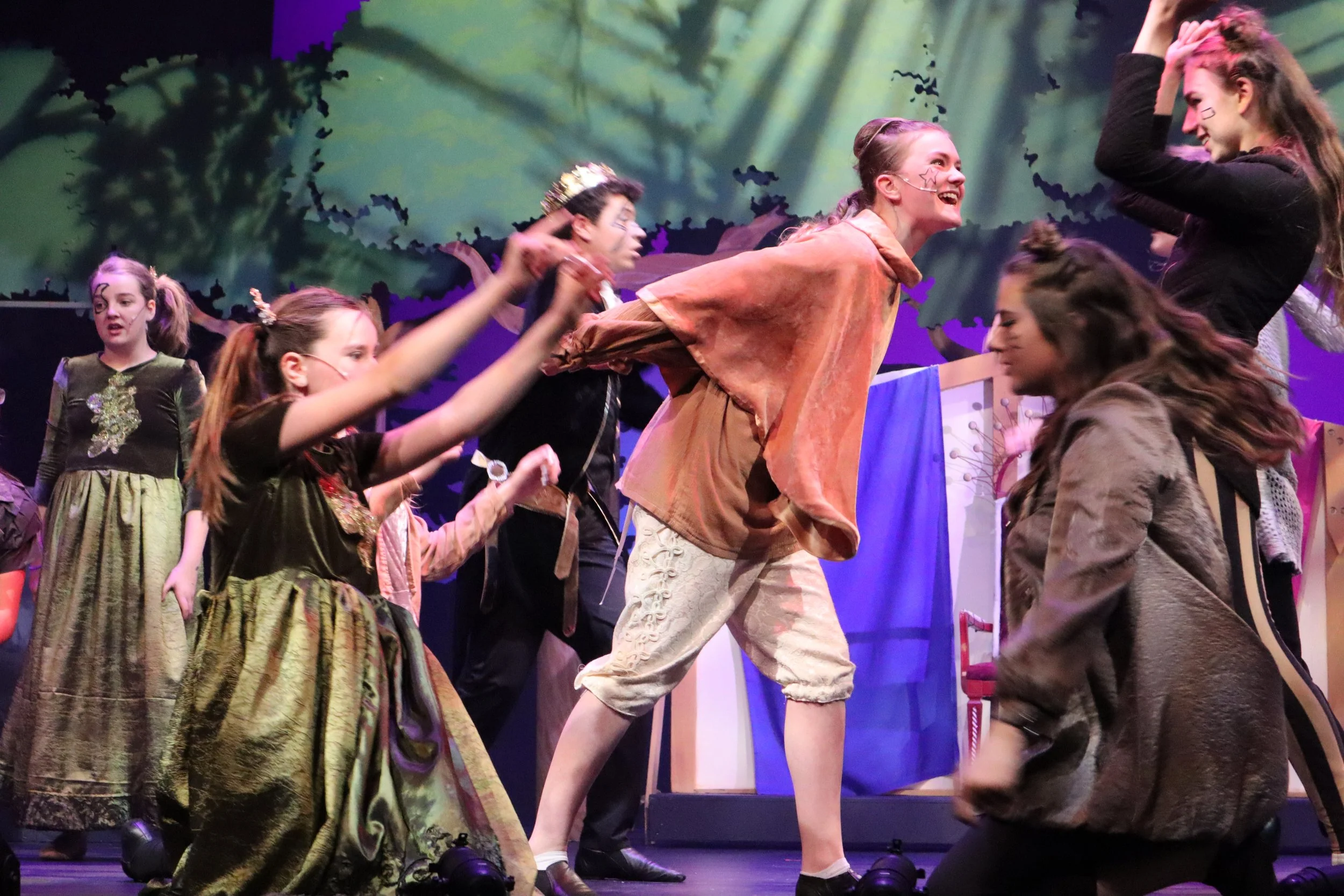 Actors laugh and dance with a forest backdrop, cheerful and animated expressions. Head Over Heels - Berkeley Playhouse